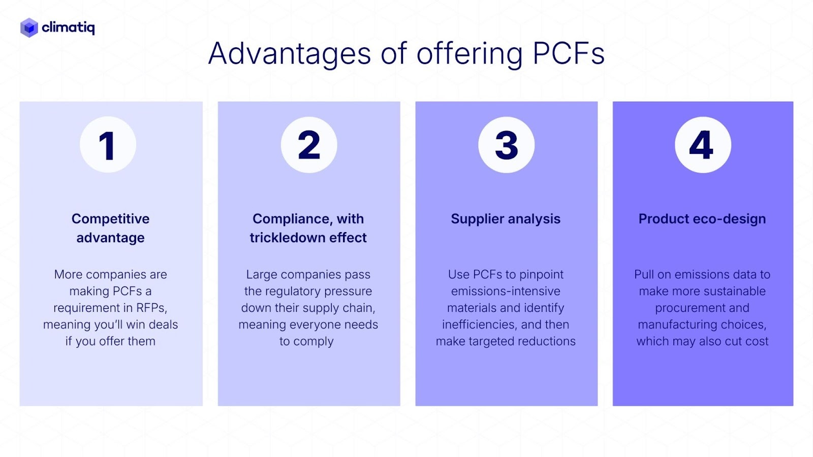 Soon, “uncomfortable” will become “untenable”. As sustainability expectations trickle down supply chains from large corporations to their mid-market and SME suppliers, PCFs will be part of the data you need to supply within any major RFP or RFQ.