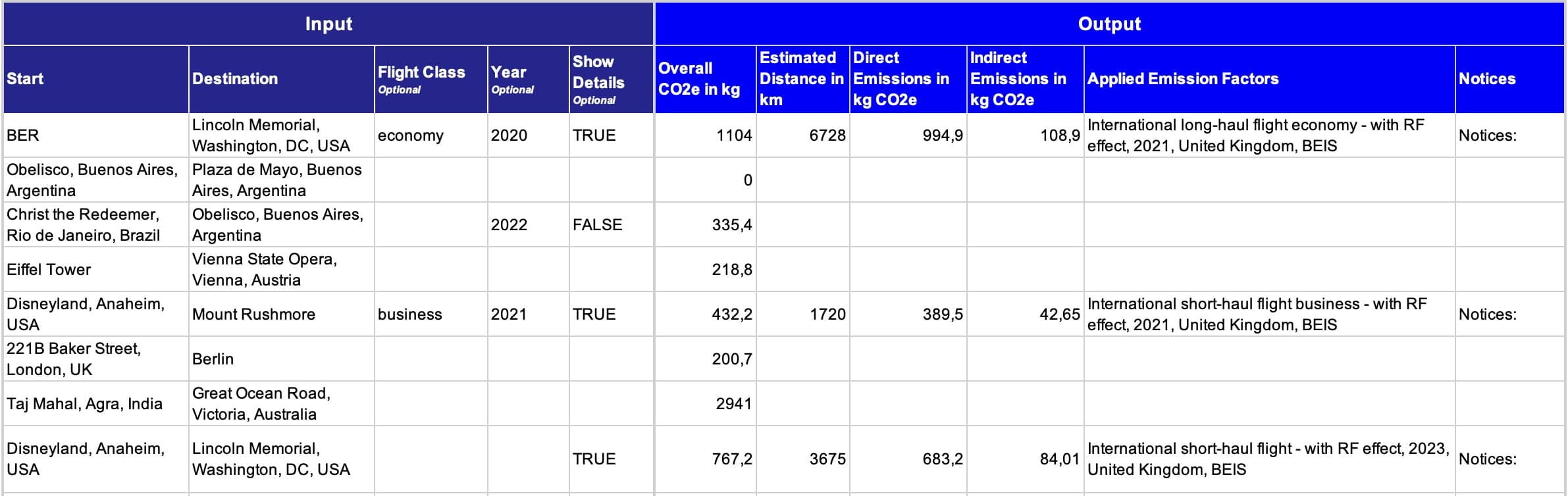 For all Estimation and Autopilot functions, you can choose whether to receive additional calculation details or just the estimated CO2e value in the response. Refer to the documentation for each formula to see which details are available. The additional details will be stored in the cells following the one containing the function.